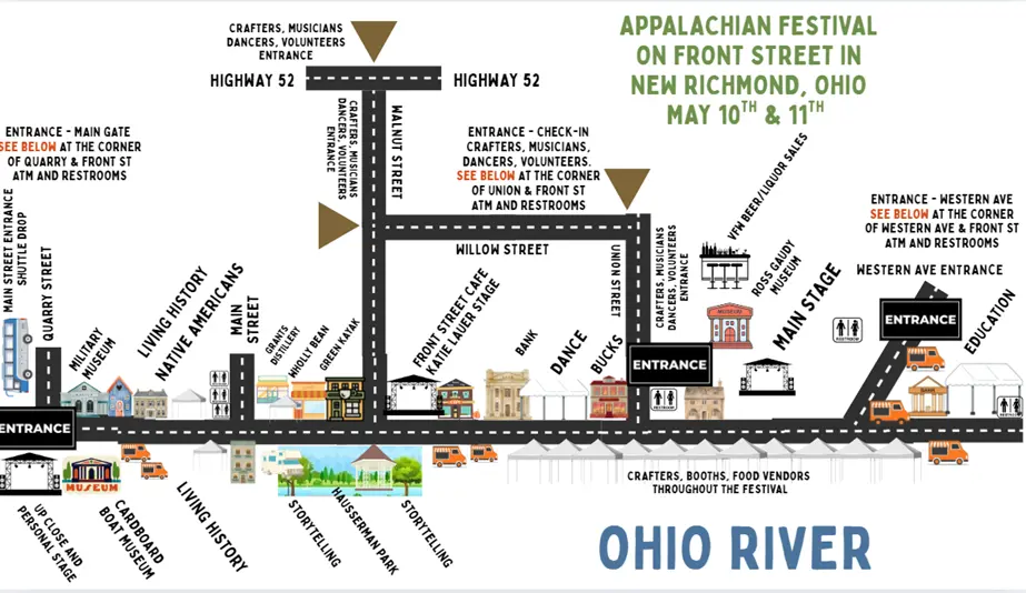New Richmond, OH The Appalachian Festival is Cincinnati’s Mother's Day weekend tradition, May 10 and 11, 2025, along Front Street in the Village of New Richmond. Immerse yourself in a celebration of Appalachian culture amidst the scenic setting. This year, mark your calendars as we bring an array of vibrant activities for all ages. From local arts and crafts to delicious traditional food, there's something for everyone. Remember, for a seamless entry to this memorable event, we're returning to a cash-only system for entrance to the event. Be sure to experience the magic of the Appalachian Festival with us and create cherished memories that will last a lifetime.