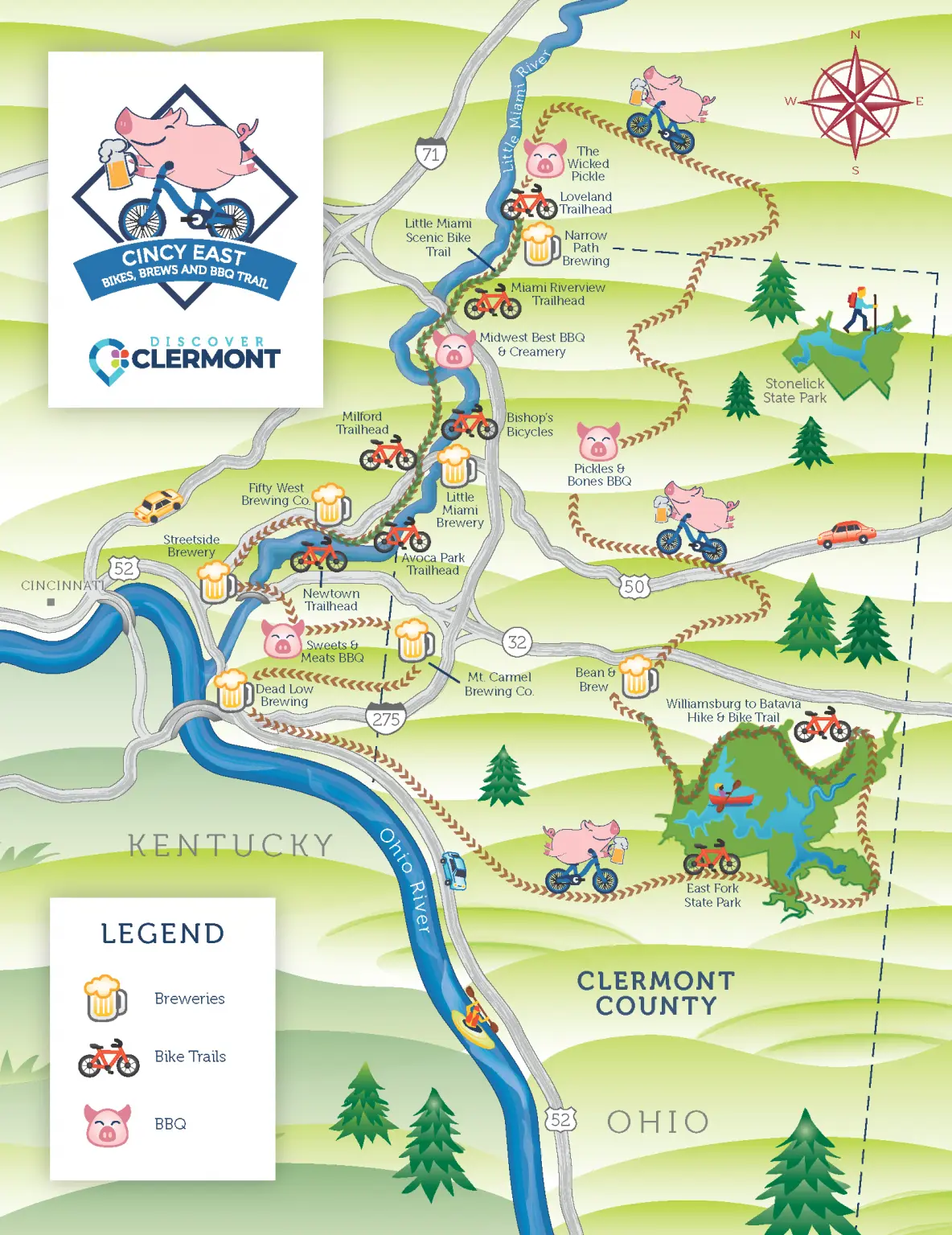 The trail features 19 locations showcasing the best biking trails, breweries and BBQ in Clermont County and the eastern Cincinnati area. This trail is designed to give visitors or local residents an incentive to get out and discover the flavors, sights and sounds that make Clermont County and the eastern Cincinnati area a unique and desirable destination.